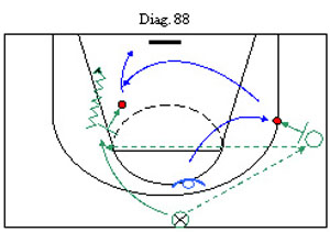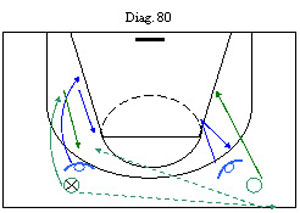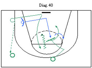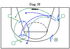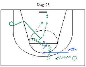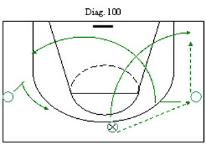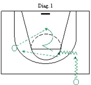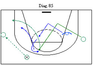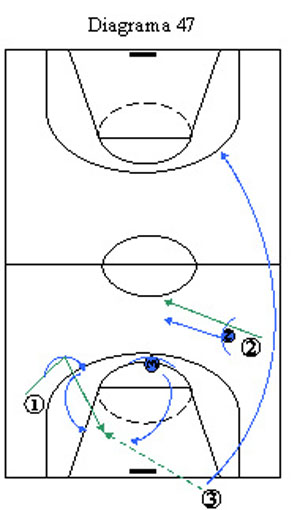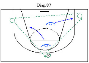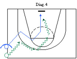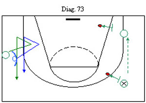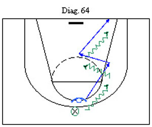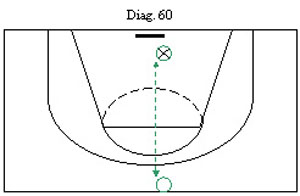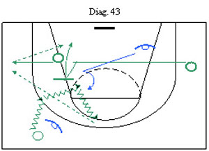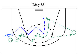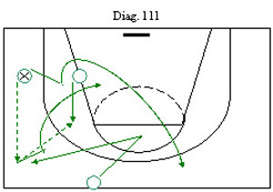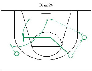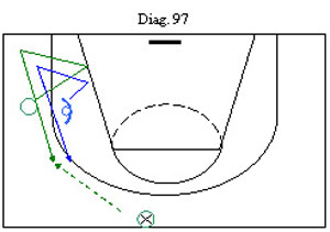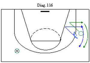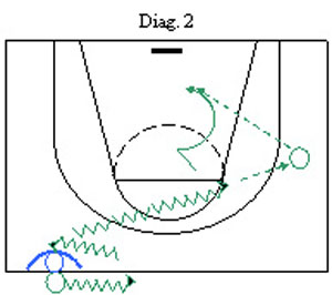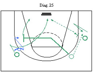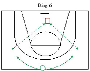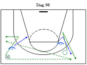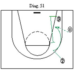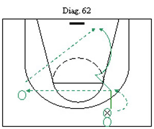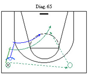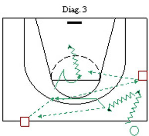 - dribling inspre lateral, schimbarea directiei si a mainii de dribling, pasa si patrundere contra unui aparator semiactiv. Pasatorul va fi in tripla amenintare inainte de a pasa. (Diag. 2 15')