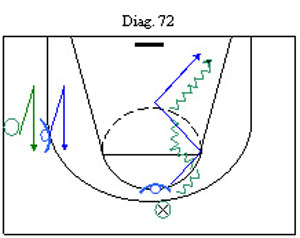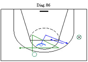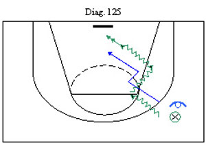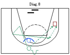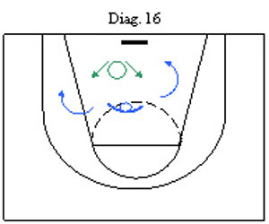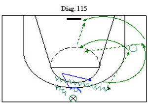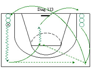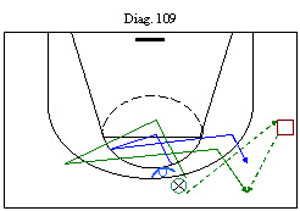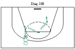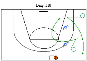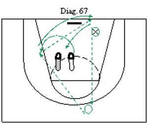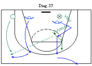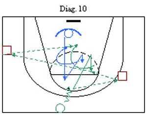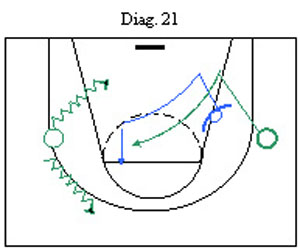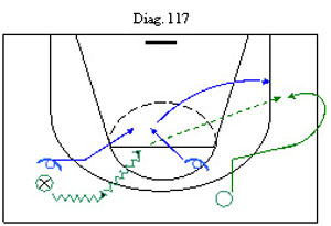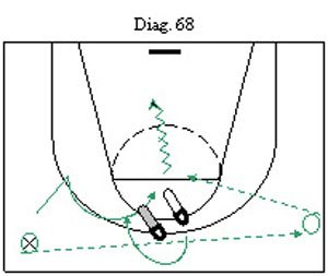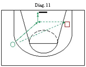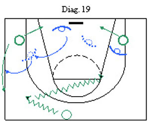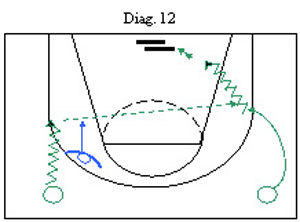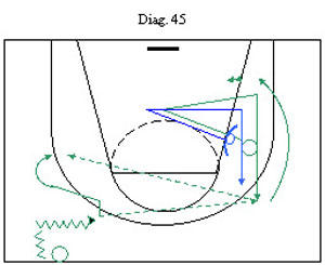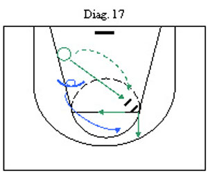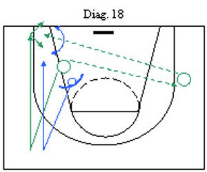 - antrenati momentul de pasare cand aparatorul vine de pe partea opusa, apoi paseaza dupa o pivotare inapoi si patrunde pentru a reprimi si arunca cu aparator semiactiv. (Diag.10 20')