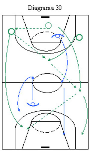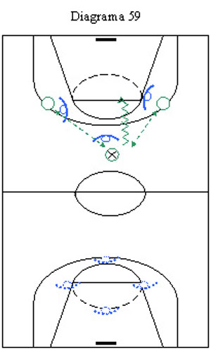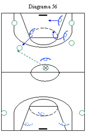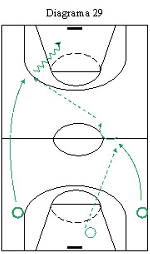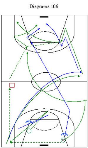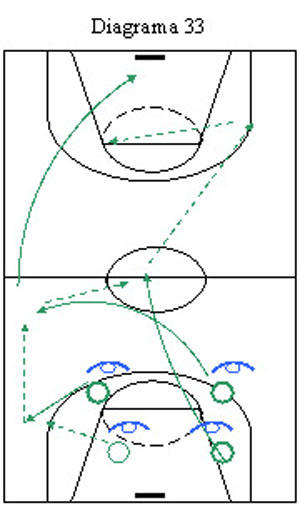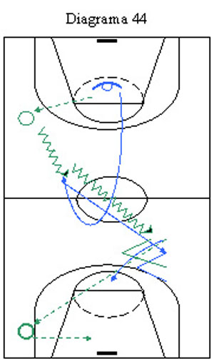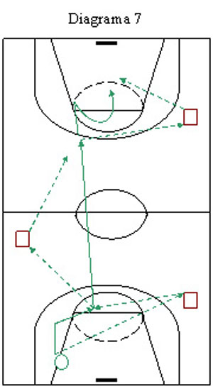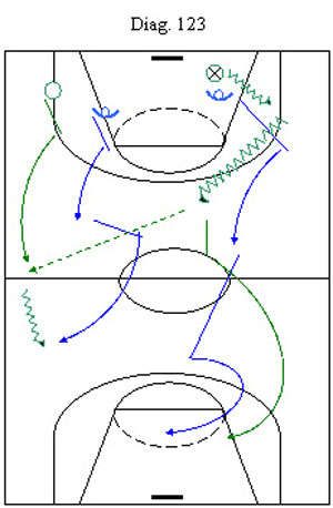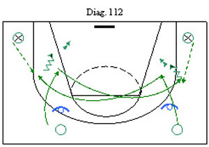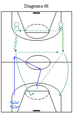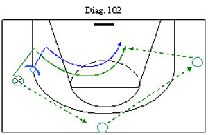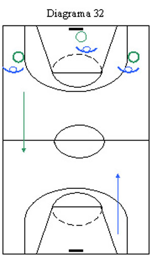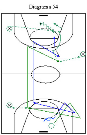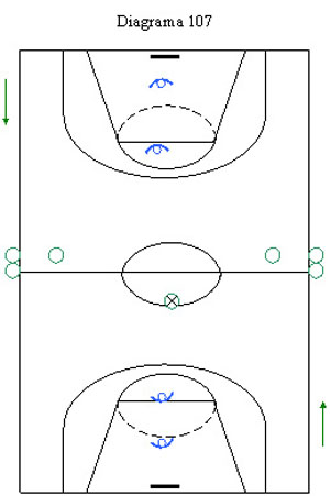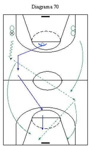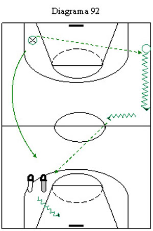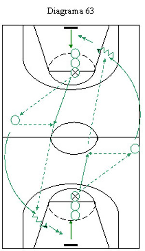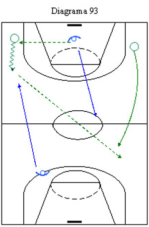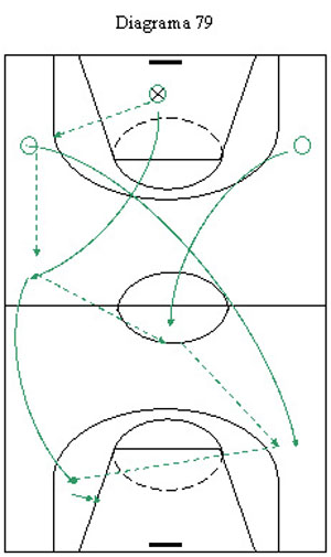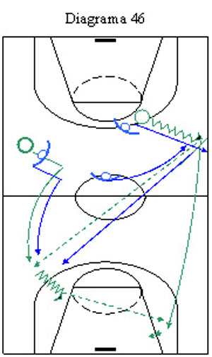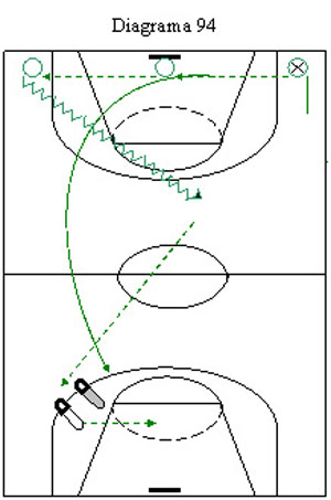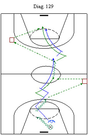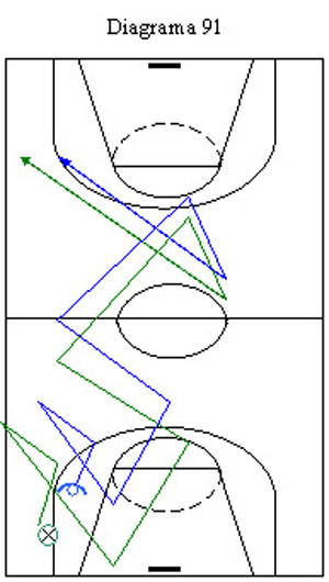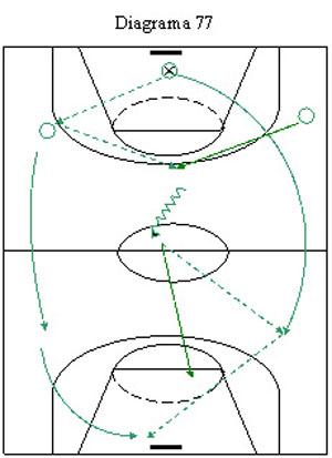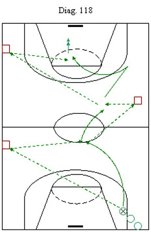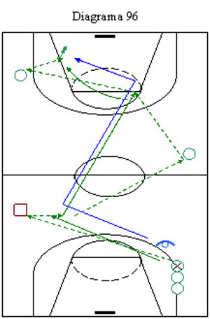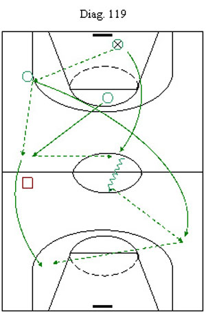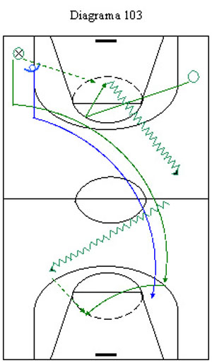 - 2x1 contraatac, dar aparatorul insoteste tot timpul acelasi atacant, in timp ce atacantul alearga sa se demarce pentru a primi mingea de la atacantul care dribleaza. La intoarcere, fostul aparator dribleaza, iar aruncatorul devine aparator, driblerul-aruncator. (Diag.103 15')