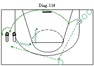- demarcaj spre partea opusa si primirea mingii pe mana dreapta, pivotare defensiva cu piciorul stang, fenta de aruncare si depasire cu pasire incrucisata pe partea dreapta, dribling si aruncare de sub cos. (Diag.114 15')