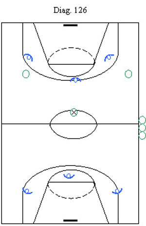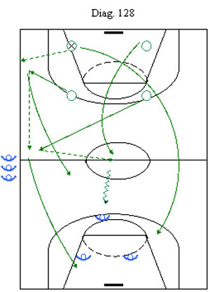 - 3x3x3 + jucatori liberi; echipa ramane in atac daca inscrie. Marcatorul iese afara si alt joc din lateral intra in loc. (Diag.126 15')
