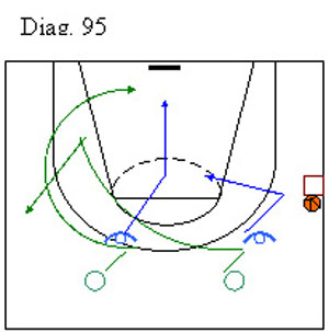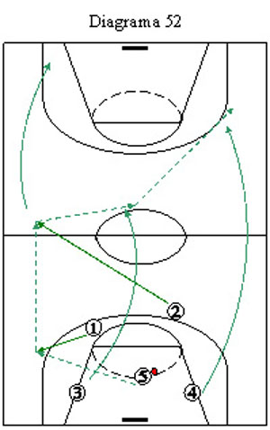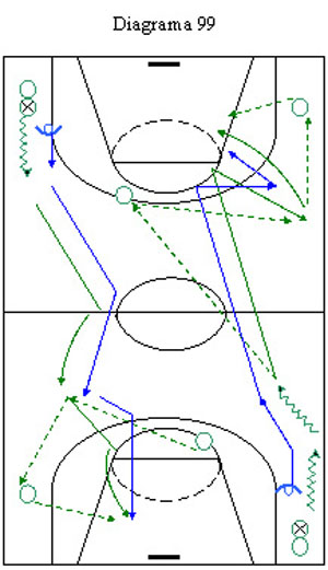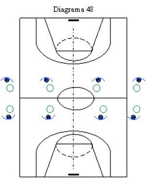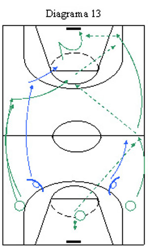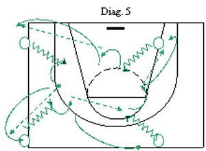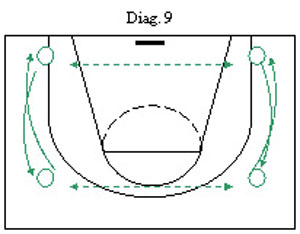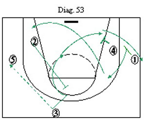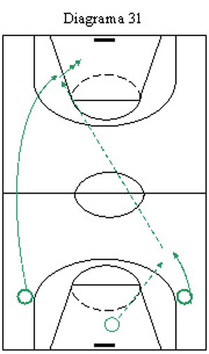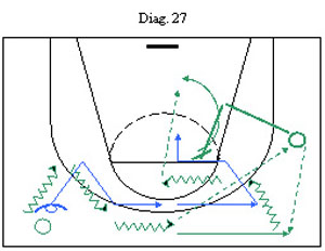 - dribling, fenta pasire cu piciorul stang, continua cu dribling cu mana dreapta, pasa la coechipier, schimbare de directie, patrundere, primirea mingii si aruncare. (Diag.1 15')