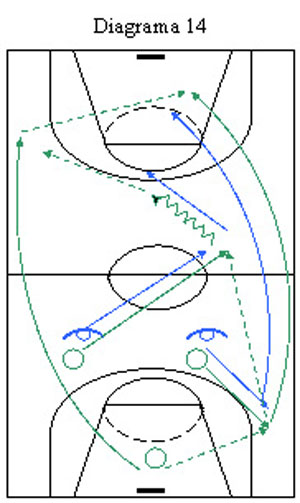 - 1+2x2; fast-breack, contraatac cu principiile de om la om (primul si al doilea primitor sunt aparati aproape). La intoarcere schimba rolurile. (Diag.14 20')