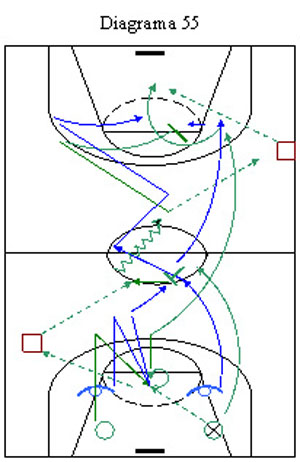 - 3x2, 3x3 exercitiu continuu; dupa 3x2 aruncatorul iese afara si ceilalti doi atacanti trec in aparare, iar aparatorii cu un jucator din lateral pleaca in atac. (Diag.120 20')
