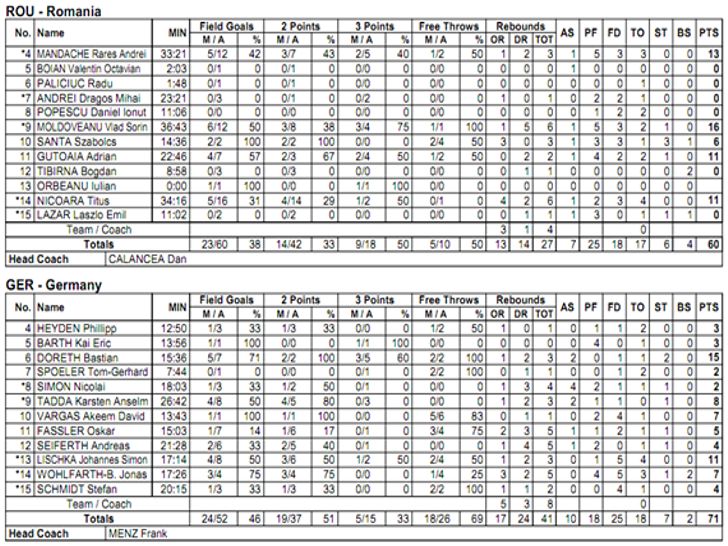 Dupa o prima jumatate a jocului echilibrata, in care Romania a fost mai tot timpul cu un mic pas in spate, dar s-a mentinut in carti, tabela indicand 24-29 in minutul 21, Germania a reusit un tur de forta in sfertul al treilea si s-a desprins la 20 de puncte pana in minutul 29, cand se inregistra scorul de 32-52. Tricolorii au apasat acceleratia pe final, dar s-au apropiat periculos prea tarziu, fiind 57-67 in minutul 38, astfel ca evolutia buna din sfertul al patrulea a contat doar pentru un partial de 26-19 si un scor decent la ultimul fluier, 60-71. Principalii marcatori ai Romaniei au fost Vlad Moldoveanu 16, Andrei Mandache 13, Titus Nicoara 11 si Adrian Gutoaia 11.