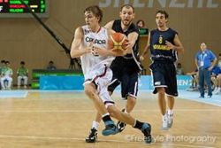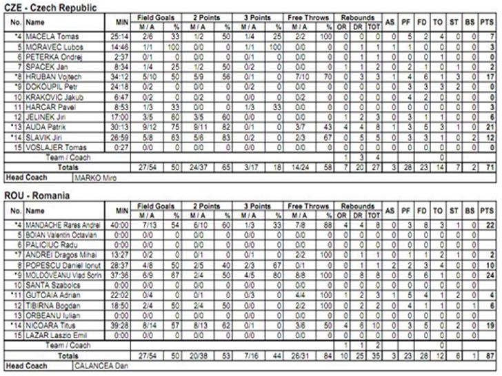 Cehia a deschis scorul prin Slavik, dar Gutoaia a egalat cu doua libere si jocul a inceput sa curga in favoarea Romaniei. Adversarii au reusit sa tina aproape pana la 6-6, dupa care a urmat un run de 13-0 al tricolorilor, pana la 19-6. Auda a pus doua puncte pe tabela pntru cehi in finalul primului sfert, dar la reluare tot romanii au tinut fraiele jocului, astfel, in minutul 22 scorul era 23-13. Cehii s-au trezit si au apasat acceleratia si in doar 3 minute au reusit sa se apropie periculos la doar 4 puncte, scor 26-22. Jocul s-a echilibrat, dar Nicoara si Mandache au luat prim-planul pe finalul sfertului secund, astfel ca la pauza mare se inregistra scorul de 40-31.