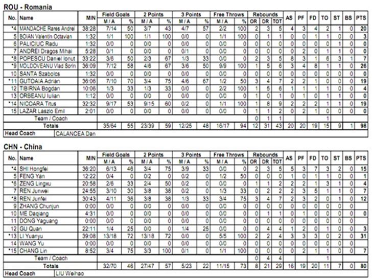 Tricolorii au inceput sa lege victoriile la Jocurile Universitare. Dupa rezultatul pozitiv obtinut in urma cu doua zile in fata Cehiei, au trecut la scor si de China, 98-80 (29-19; 15-21; 30-20; 24-20). Romanii au inceput confruntarea in formula: Andrei Mandache, Daniel Popescu, Vlad Moldoveanu, Adrian Gutoaia si Titus Nicoara. De partea cealalta, tara gazda i-a trimis in teren pe Shi, Zeng, Ren, Li si Chang.