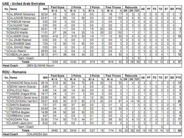 VICTORIE! Tricolorii au zdrobit reprezentativa Emiratelor Arabe Unite cu scorul de 68-37 (22-13, 9-7, 20-10, 17-7) si s-au calificat in faza sferturilor de finala, unde vor da piept cu prima clasata din Grupa B, Canada. Principalii marcatori ai Romaniei au fost Vlad Moldoveanu 20, Titus Nicoara 17 si Andrei Mandache 13.