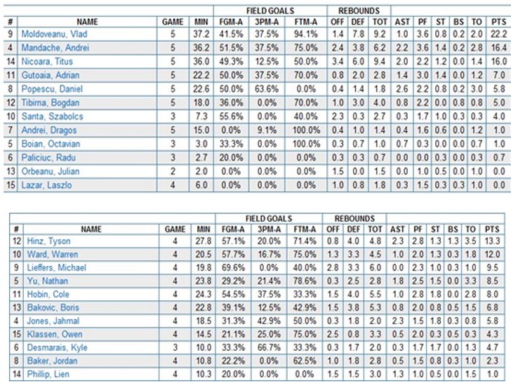 Nationala Universitara impresioneaza la Shenzhen. Calificati in primele opt echipe de la Jocurile Universitare, alaturi de Germania, Serbia, Canada, Rusia, Lituania, Statele Unite si Finlanda, ai nostri domina si in statistici. Vlad Moldoveanu, Andrei Mandache, Titus Nicoara si Dani Popescu se afla printre performarii fazei grupelor.