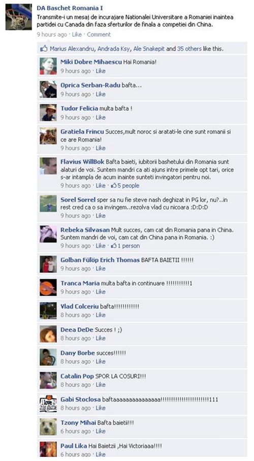 La initiativa dabaschet.net si prin intermediul site-ului de socializare Facebook, iubitorii baschetului din Romania le-au transmis mesaje tricolorilor inaintea meciului cu Canada din cadrul sferturilor de finala ale Jocurilor Universitare de la Shenzhen. Partida Romania – Canada de joaca astazi, incepand cu ora 13:00, ora Romaniei. Suntem cu gandul si sufletul alaturi de voi. DA Romania!