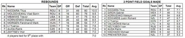 De asemenea, Titus Nicoara si Vlad Moldoveanu ocupa primule doua locuri in topul celor mai buni recuperatori, cu 80, respectiv 76 rebounds in opt partide. Titus Nicoara si-a asigurat prima treapta si in topul cosurilor de doua puncte, cu 57 de astfel de reusite si o medie de 7.1 pe meci.