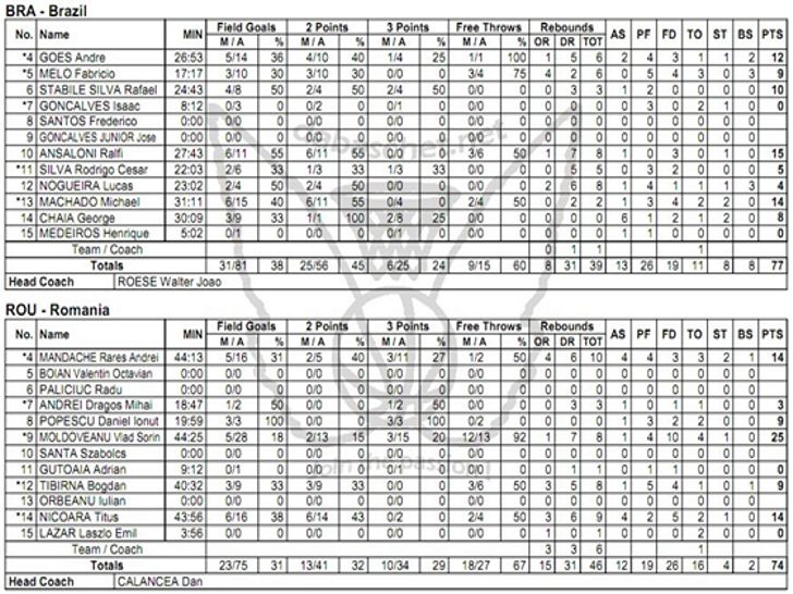 Romania a fost condusa 2-6 in debutul meciului, dar Tibirna si Nicoara au intors scorul la 8-6, iar universitarii romani si-au adjudecat primul sfert cu scorul de 17-15. Partida a continuat mai putin bine pentru reprezentantii nostri, brazilienii distantandu-se la 19-25 pana in minutul 15. Mandache a incercat sa-ti trezeasca echipa cu o reusita de 3, scor 24-27, dar jocul a curs tot in favoarea adversarilor care au intrat la vestiare cu avantaj de 8 puncte, 27-35.