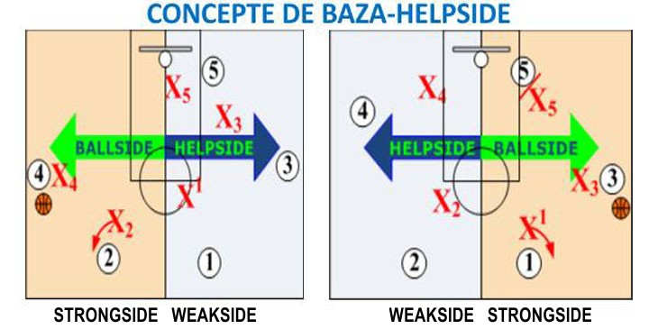 Helpside nu este un loc de relaxare si pauza. Dimpotriva deoarece aparatorii de pe weakside au responsabilitati si pentru oponent si pentru jucatorul cu mingea suportul necesita multa vigilenta si munca pentru a contesta actiunea dribleorului.