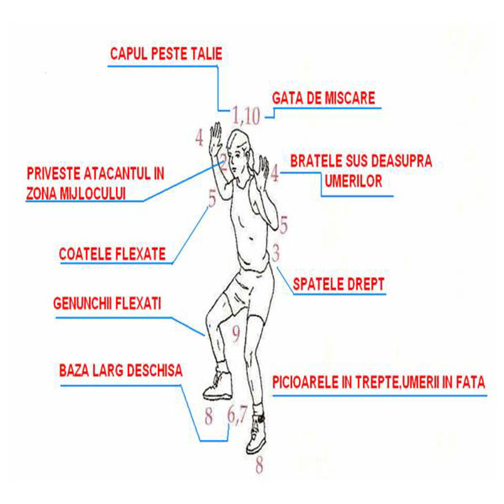 POZITIE DEFENSIVA BUNA, NASUL IN PIEPT, CALCAI-VARF-CP, PUTIN MAI SUS BRATELE (APROXIMATIV LA NIVELUL UMERILOR), CU O MANA CONTESTA SUTUL CU CEALALTA PASUL, GENUNCHII FLEXATI, CAPUL DEASUPRA TALIEI, SPATELE DREPT, COATELE FLEXATE, BAZA LARG DESCHISA, PICIOARELE IN TREPTE.