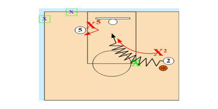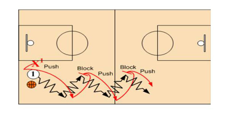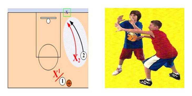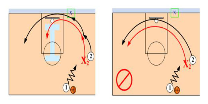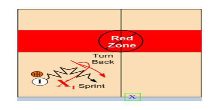 Cand aparatorul nu poate inchide, trebuie sa forteze dribleorul peste zona rosie catre linia laterala opusa.