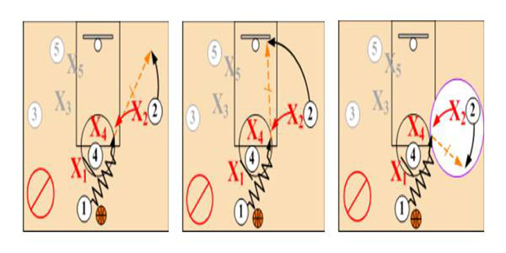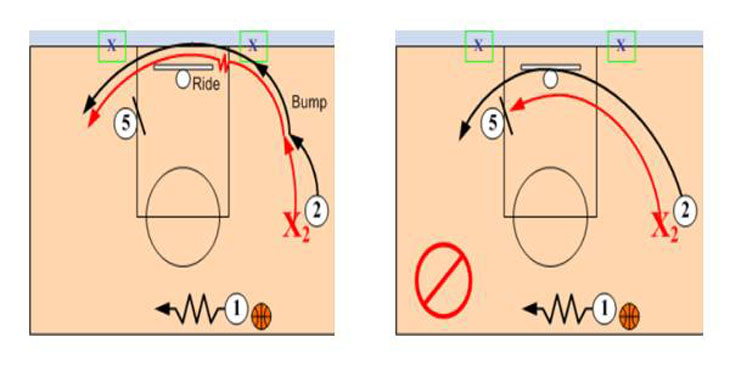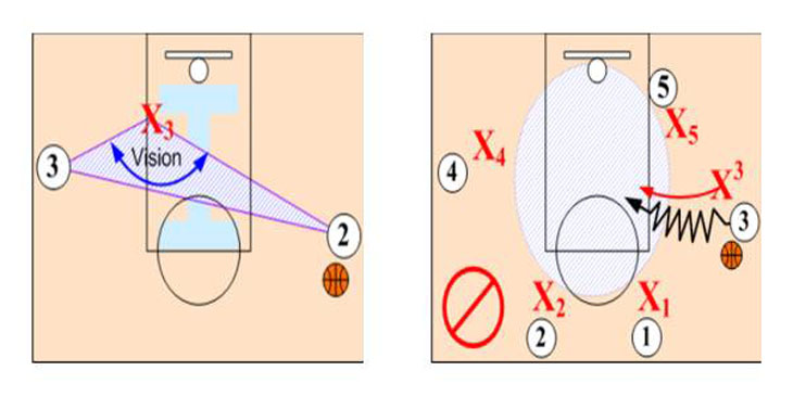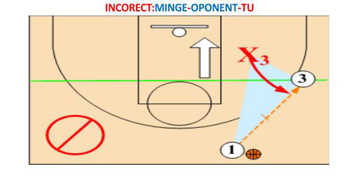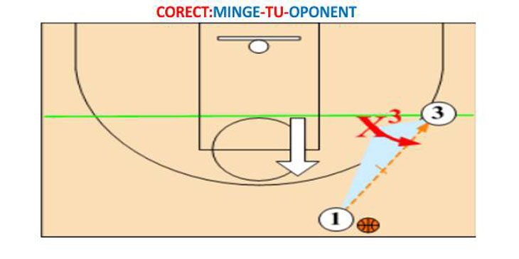 Nu permiteti atacantului care taie de pe weakside sa penetreze in spatiul de trei secunde. Cand atacantul de pe weakside taie catre dribleor, aparatorul trebuie sa faca un pas in sus (STEP UP)si sa blocheze atacantul. Dupa ce este blocat atacantul, aparatorul asuma o puternica pozitie de refuz, fortand directia top pushpoint.