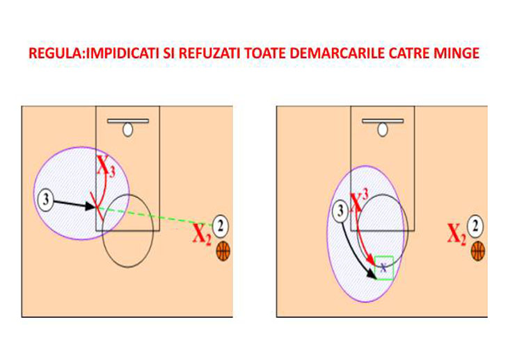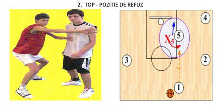 A. DENY FLASH-cand jucatorul post de pe weakside urca in zona high post, aparatorul trebuie sa conteste demarcarea cu o puternica pozitie de refuz si sa forteze atacantul catre top pushpoint.