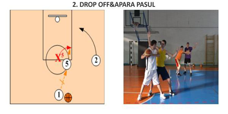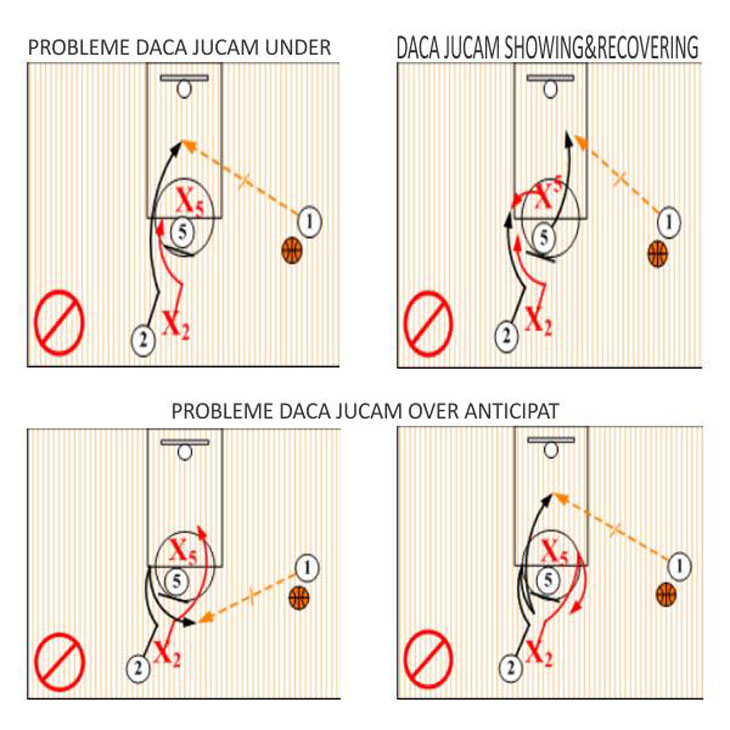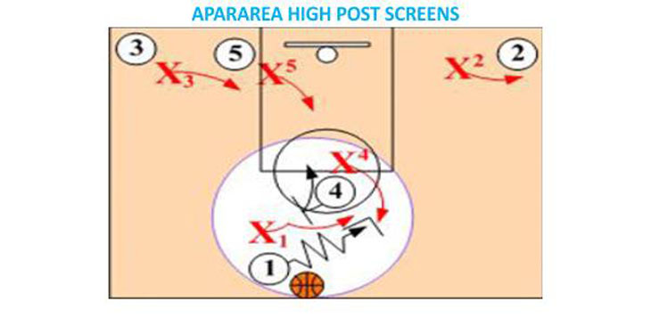 In majoritatea cazurilor cand atacul joaca cu high post vom avea o actiune de pick & roll. Avem mai multe optiuni de aparare a actiunii in functie de calitatile atacantilor.