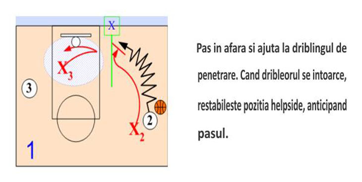 Cand dribleorul penetreaza spre cos, aparatorul ball side (strong side) mentine o pozitie puternica de refuz si NU AJUTA. Responsabilitatea ajutorului revine jucatorilor de pe partea slaba care trebuie sa roteasca pentru a stopa patrunderea.
