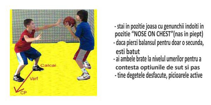 Genunchii flexati, corpul in pozitie joasa, partea superioara a corpului in pozitie verticala si pieptul in afara. Tineti capul stabil, evitand miscari ale corpului sus-jos. Presiune la minge cu mana care apara directia in care se deplaseaza atacantul, dar fara atingere. Tineti capul deasupra taliei, bratele aproape de corp si coatele flexate pentru a va ajuta sa mentineti balansul.