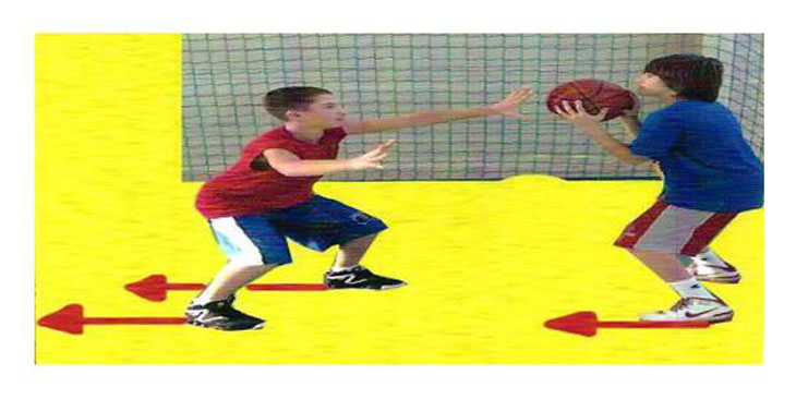 Mentineti balansul (echilibrul) si o pozitie defensiva tot timpul intre atacant si cos. Daca atacantul se misca in lateral schimbati rapid pozitia picioarelor din cea in trepte in cea paralela cu amandoua picioarele in linie cu directia de deplasare. Folositi pasi mici si rapizi avand greutatea distribuita intre picioare. Concentrati-va sa mentineti balansul cand schimbati rapid directia.