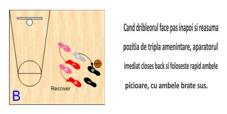 Cand dribleorul schimba directia, aparatorul contracareaza, executand rapid drop step si forteaza atacantul catre pushpoint.