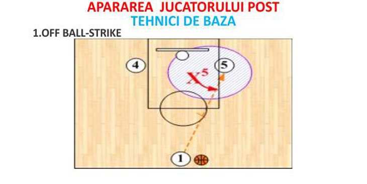 A. Cand mingea este pe aripa, aparatorul post de pe weakside asuma o pozitie de ajutor "STRIKE", pregatit sa ajute coechipierii, sa faca double team, sa refuze flash cuts si sa recupereze.