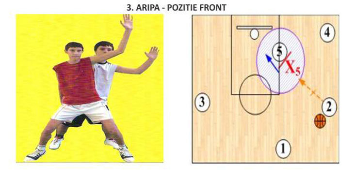 O folosim atunci cand atacantul nu prefera contactul fizic. Aparatorul asuma o pozitie full front cu fata catre atacant, piept in piept, cu ambele brate ridicate. Mentineti contactul vizual cu mingea, intorcand capul peste umar.