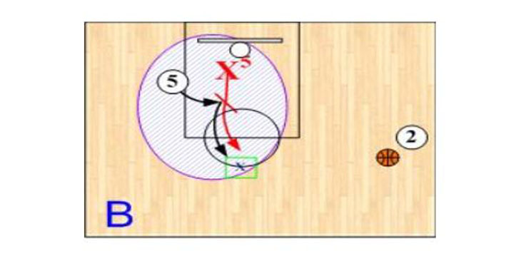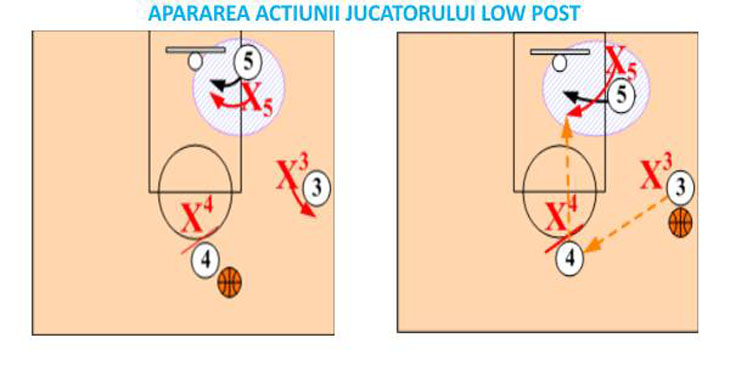 B. FORTEAZA IN AFARA-aparatorul lui high post trebuie sa conteste orice pas catre acesta si sa caute ca mingea sa fie primita de high post departe de cos. Astfel marim distanta dintre cei jucatori post dand posibilitatea aparatorului low post sa obtina o buna pozitie defensiva.