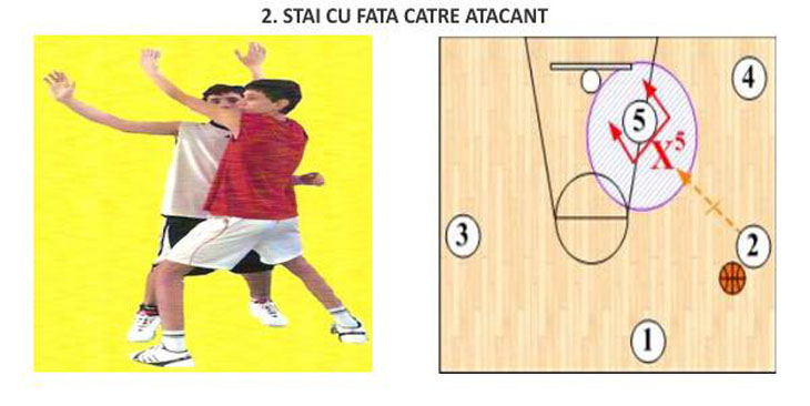 Agresiv o pozitie front sau asumati 3/4 o puternica pozitie de refuz cu bratul intins pe linia de pasare. Nu va lasati prins in spatele jucatorului low post.