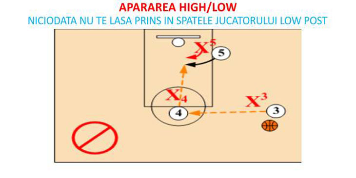 Ori de cate ori mingea este pasata la low post, aparatorul lui high post trebuie sa anticipeze rularea acestuia catre cos.