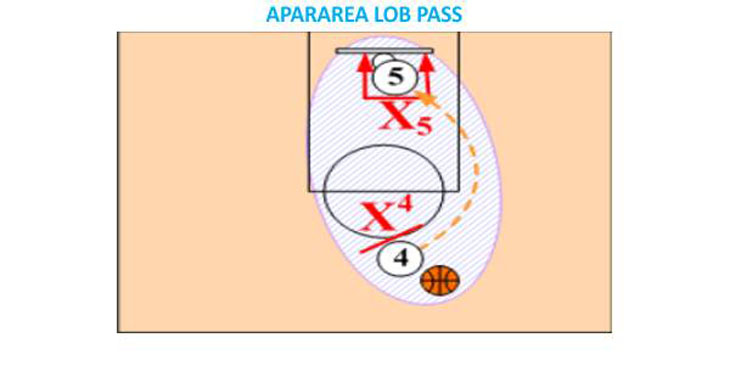 In apararea pasului lobat este important sa fortam atacantul departe de cos si sa folosim activ bratele pentru a contesta pasul. Cand aparatorul low post este front, trebuie sa aiba genunchii indoiti si sa conduca atacantul sub cos.